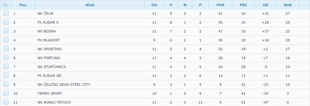 Čelikovi pioniri su prvi na tabeli i nakon odiganih 11 utakmica imaju 27 bodova.
