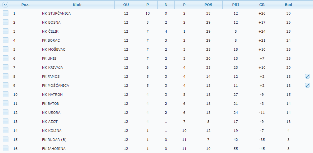 Tabela Druge lige FBiH – grupa “Centar”